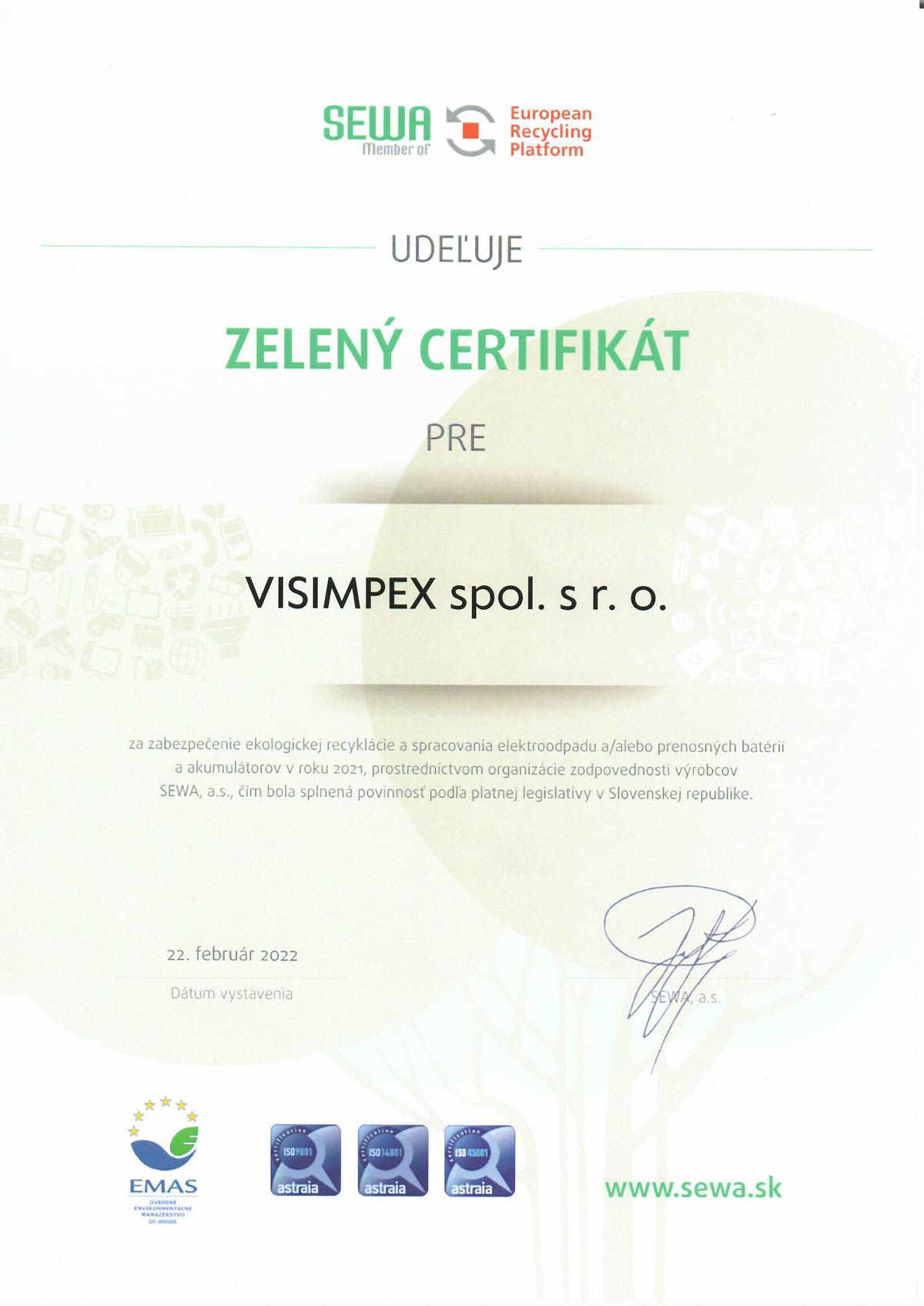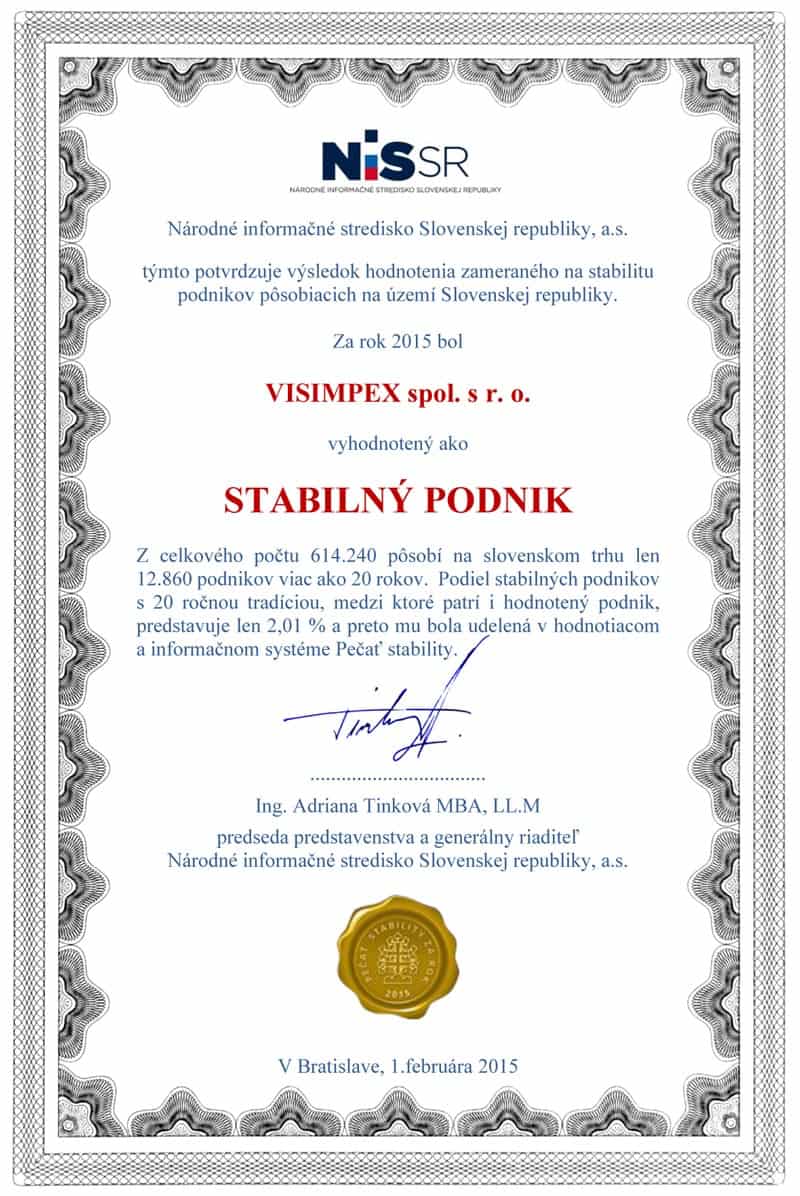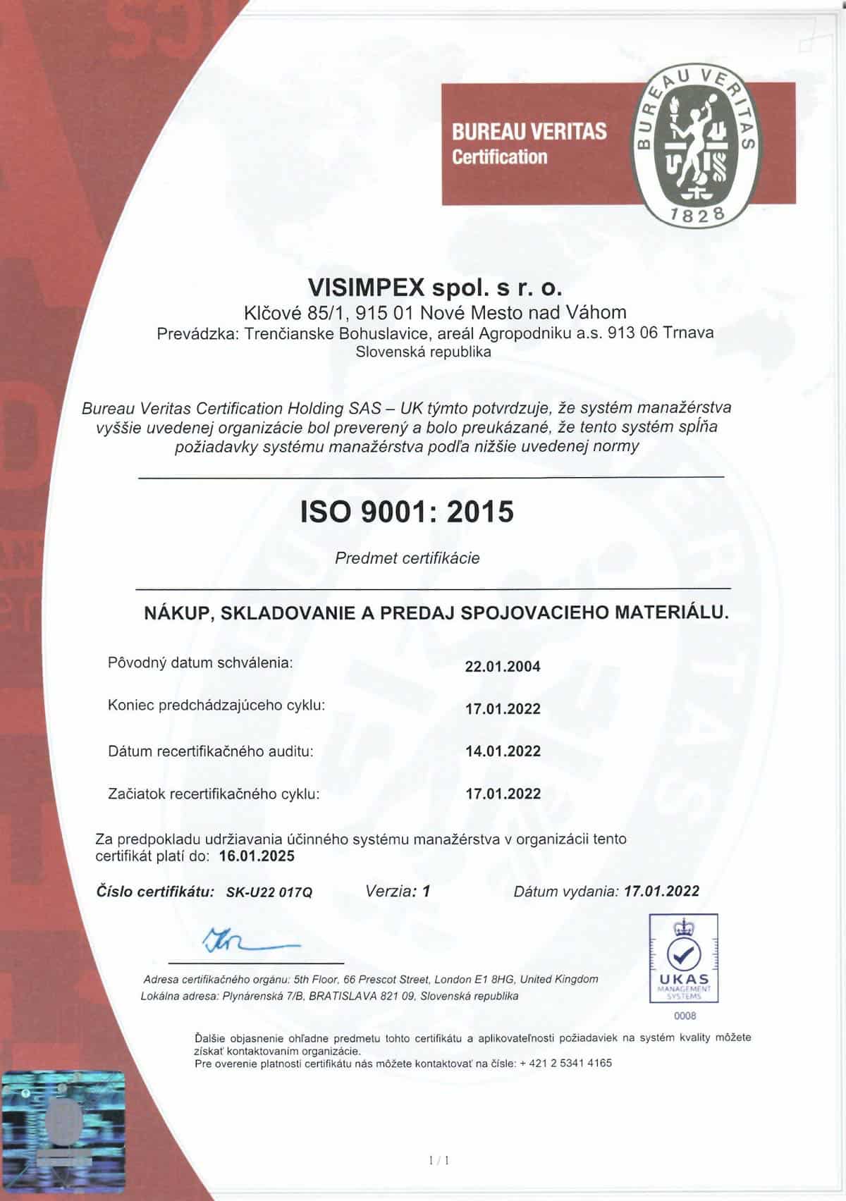 Všetci odberatelia spoločnosti Visimpex spol. s r.o. požadujú ako samozrejmosť dodávky kvalitného sortimentu spojovacieho materiálu. Naša spoločnosť ako už bolo spomenuté v úvode, získala certifikát systému manažérstva kvality ISO 9001:2000 v roku 2004 a v nasledujúcich rokoch bola priebežne recertifikovaná. Naposledy v roku 2019 sme boli úspešne recertifikovaní na systém manažérstva kvality ISO 9001:2015.